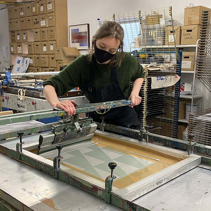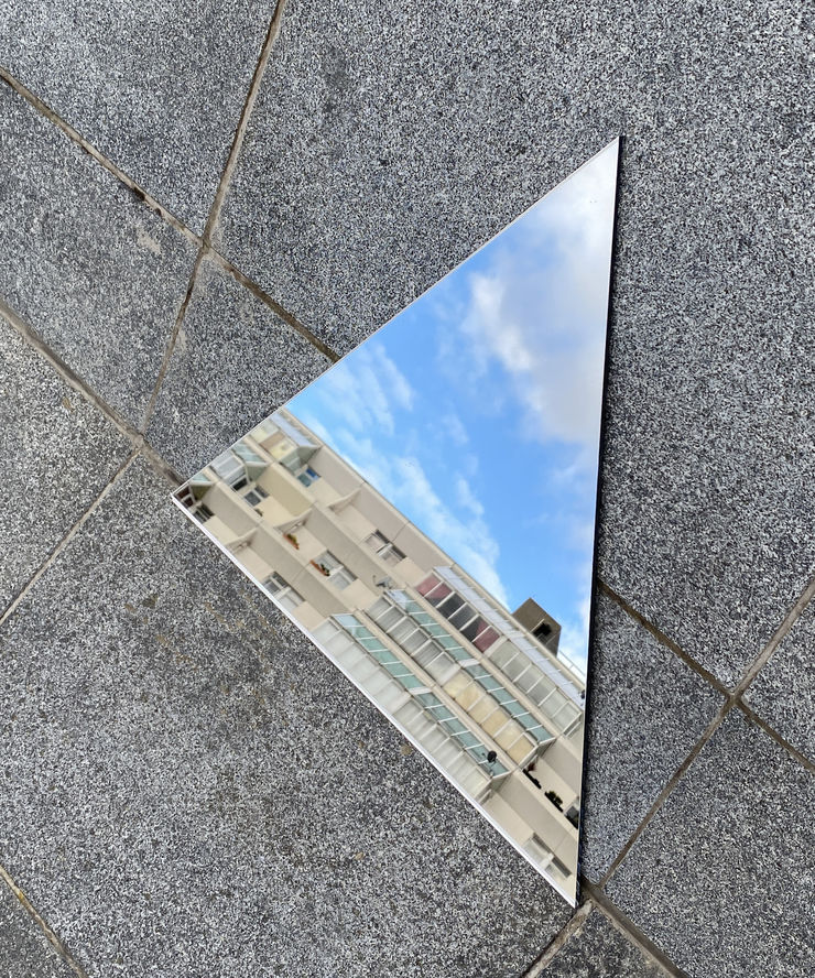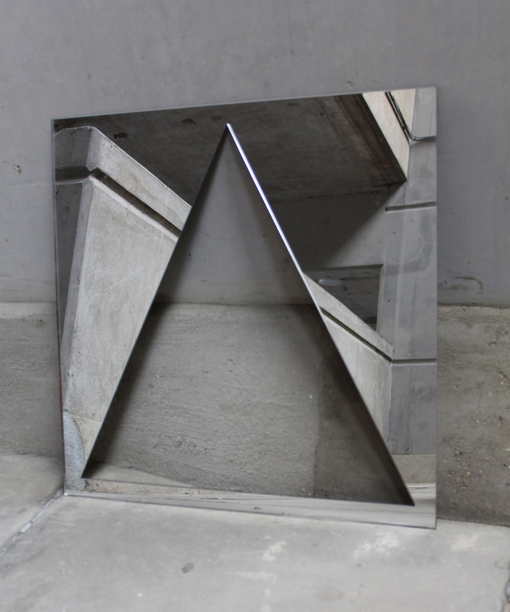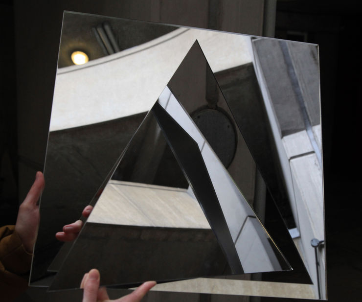 During her residency Grady developed her research project Vanishing Points. The title is a nod to the compositional technique commonly used to create perspective drawings that allows lines to converge at an endpoint. She looked to blur the reality of the physical space, exploring its ability to channel light and colour, stripping back to the fundamental structure of the building's core design. The resulting work is the large scale window installation Vanishing Points, a new series of unique screenprints, mirrored perspex interventions, photographs and a short films.