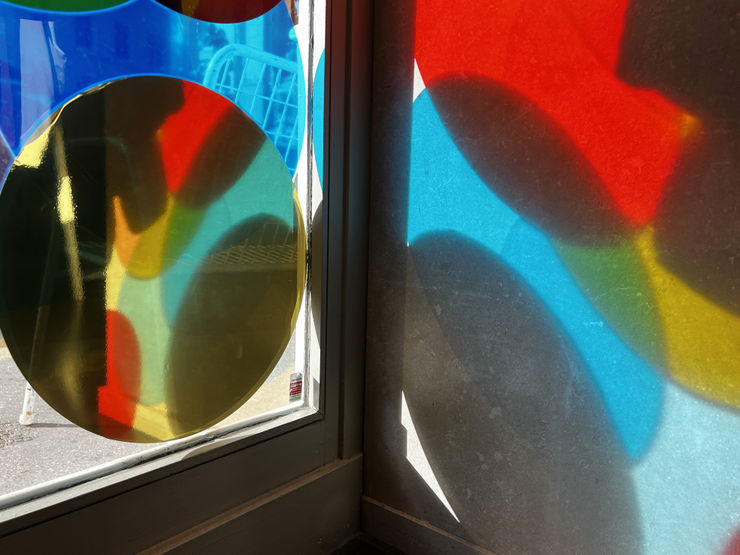 Radiant Auras is a continuation of Grady's exploration into the application of colour and reflective materials to create a sources of light. The transparent coloured circles are a harmonious palette of tones that when placed together appear to glow. They indicate a radiant light that scatters across the windows spilling into the shop interior and onto the pavement outside. The sequence of shapes could be many things: the blurring of lights, water droplets, halos, or even bouncing balls. They are purposefully open to interpretation allowing the viewer to bring their own connotations to the work. However as they playfully dance across the glass the luminous orbs introduce an ambient aura to their setting.