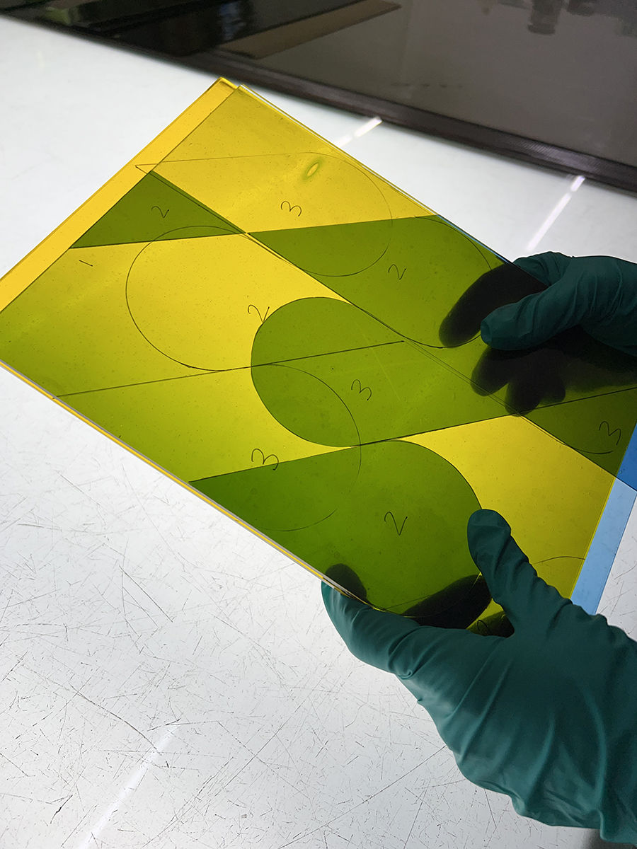 While visiting the studio Fiona created a series of designs to exploit the character of the glass sheets. She turned two of her drawings into hand cut masking film stencils and worked with the glass technicians' reduction method to acid-etch the glass and create layered tones of transparent colour. The unusual properties of the glass sheets allow them to be acid-etched to lighten or remove the colour to create a variety of tones within one panel. Resulting in refined cut lines and varied intensities of colour. The pieces really have to been seen in person to fully appreciate the beauty of the delicate materials! The final designs are now available to see at Fiona's studio in London.